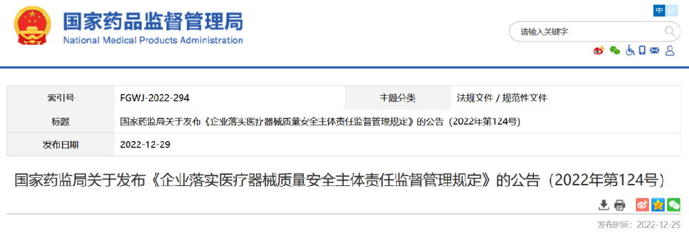 2022年12月29日,國家藥品監(jiān)督管理局發(fā)布《企業(yè)落實(shí)醫(yī)療器械質(zhì)量安全主體責(zé)任...